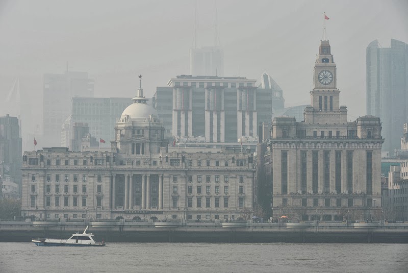 杭州西湖完全被浓雾锁住,水天一色灰蒙蒙。在上海,黄浦江边的高楼在雾霾中隐现,网友戏称“去江边看到海市蜃楼”。