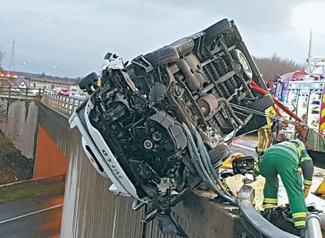 西媒称,英国中部城市利兹附近一座大桥上发生事故,一辆卡车冲破护栏悬在桥边,卡车司机被困驾驶室内。就在千钧一发之际,警察马丁·威利斯出现了,这位英雄阻止了悲剧的发生。