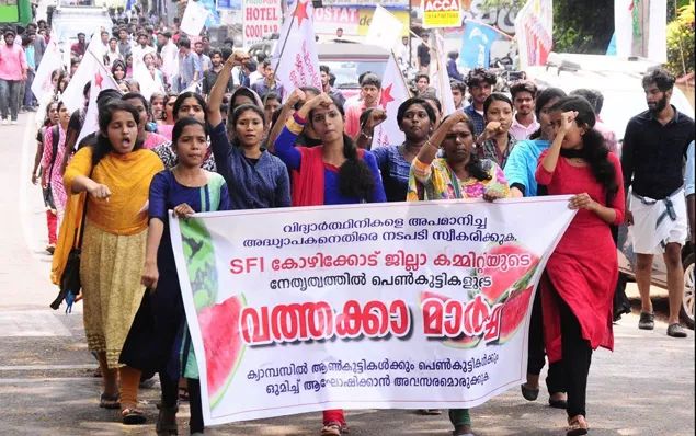“老师应该看着我们的脸上课,而不是看着我们的身体!”卡利卡特大学的学生会主席苏娅(Suja P)在抗议现场叫道。