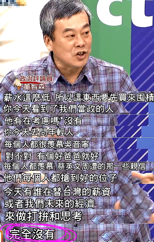 政治评论员董智森表示,薪水已经这么低了,但并没有看到台当局有人为经济做打拼和思考,他还调侃,如今岛内年轻人都很羡慕那个“有个好爸爸”的吴音宁及蔡英文周遭的亲信,因为“每个人都能抢到(拿钱多还不用干事儿啊)好位置”。