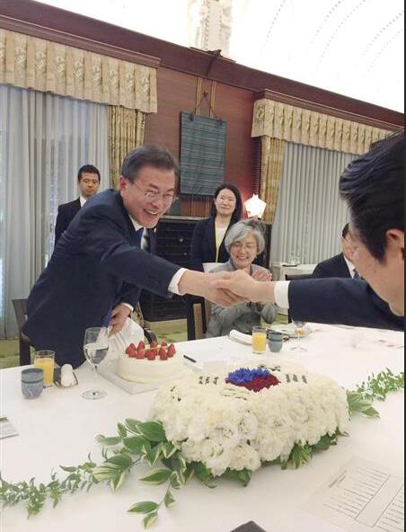 据日本媒体5月11日报道,日本首相安倍晋三于本月9日在首相官邸与韩国总统文在寅共进午餐。席间安倍向文在寅送上了一份“惊喜”——一份草莓蛋糕,以祝贺文在寅10日迎来就任总统一周年。
