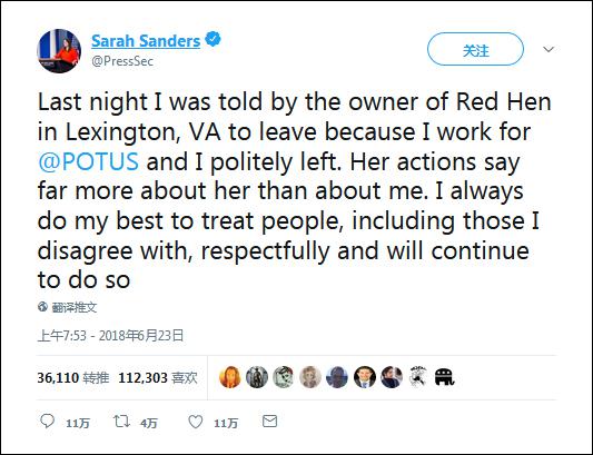 据此前报道,当地时间23日,白宫女发言人桑德斯同样是在推特上称,自己22日晚被弗吉尼亚州一家名叫“Red Hen”的餐厅轰出了门,理由是她在替特朗普效力,而她“很有礼貌地离开了”。