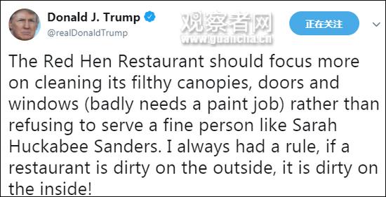 特朗普称,“Red Hen(红母鸡)餐厅应该把更多的精力放在清理那些肮脏的遮棚、门和窗户上(急需刷漆),而不是拒绝服务一个桑德斯这样的好人。我总觉得,如果一个餐厅的外面是脏的,那它里面也是脏的!