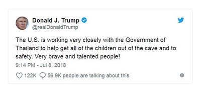 周日早上,在泰国溶洞救援正如火如荼地展开之际,之前一直没有对此事表现过太多关注的特朗普突然在推特上发布一条消息称:“美国正与泰国政府密切合作,帮助所有的孩子从洞穴中安全获救。人们非常勇敢,才能卓越!”