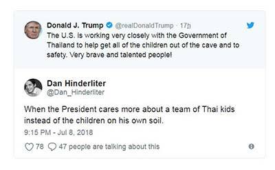 周日,勤于“推特治国”的特朗普又在推特上为自己打CALL了,也毫无意外地又遭到了很多人的犀利吐槽和强烈反对。这次,他发布的是一条有关泰国溶洞救援的推文。