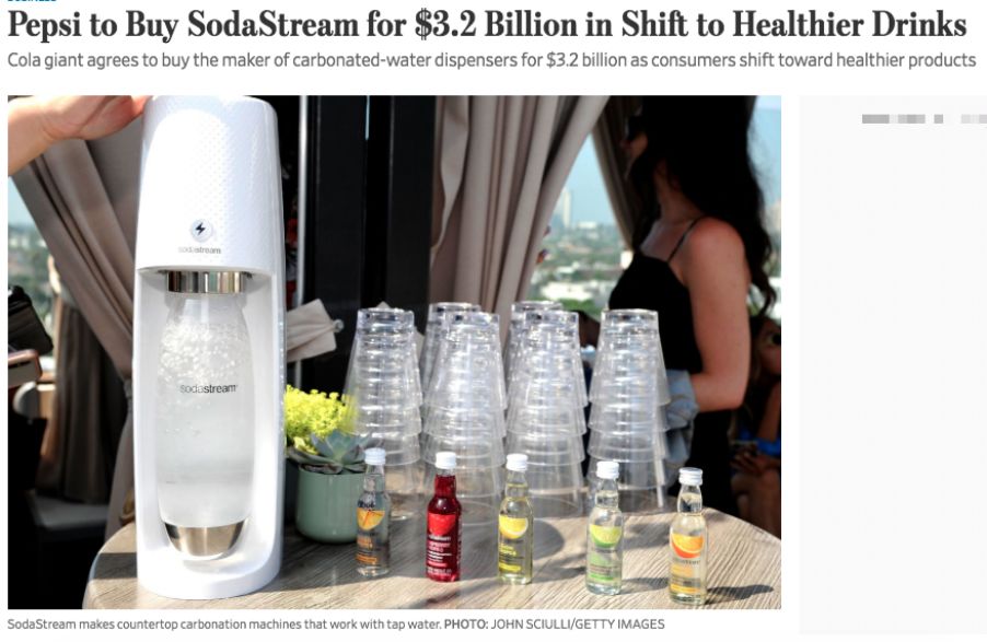 据华尔街日报,全球饮料巨头百事公司已同意斥资32亿美元收购以色列一家生产台面水碳酸化机公司SodaStream International Ltd。。该公司的设备可以让人们在家里就用普通的瓶子制作碳酸饮料。