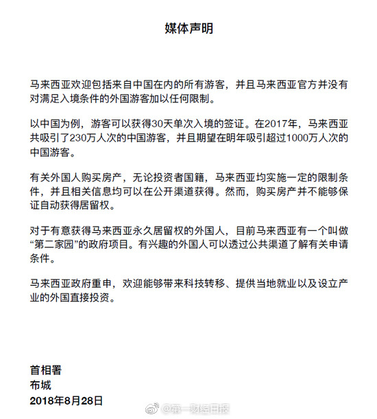 马来西亚首相府发表声明称,欢迎包括来自中国在内的所有游客,并且马来西亚官方并没有对满足入境条件的外国游客加以任何限制。有关外国人购买房产,无论投资者国籍,马来西亚均实施一定的限制条件。然而,购买房产并不能够保证自动获得居留权。对于有意获得马来西亚永久居留权的外国人,目前马来西亚有一个叫做“第二家园”的政府项目。有兴趣的外国人可以透过公共渠道了解有关申请条件。马来西亚政府重申,欢迎能够帯来科技转移、提供当地就业以及设立产业的外国直接投资。