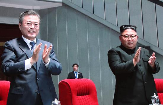 据韩联社报道,文在寅与15万名朝鲜观众一同观看大型团体操与艺术演出《辉煌的祖国》,并致辞说,“我和金正恩委员长将携手韩朝8000万韩民族同胞建设新的祖国,让我们一起走向新的未来。我提议韩朝彻底消除过去70年来的敌对,朝着统一与和平迈出一大步。”