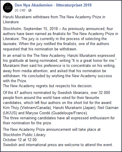 因爆发性侵丑闻,诺贝尔文学奖评选单位——瑞典学院今年暂停颁布该奖项。瑞典文化界人士随后推出诺贝尔文学奖的替代品“新文学奖”(New Academy Prize in Literature),日本作家村上春树入围。
