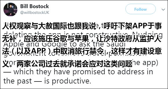 因这一APP引发的讨论并不多,目前推特上热门帖下面留言最多的为100来条,点赞与转发只有3000。其中不乏对沙特与互联网公司持批判态度的网友: