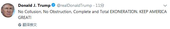 特朗普在推特上回应美国司法部公布的通俄调查主要结论:没有共谋,没有阻碍,完全彻底无罪,让美国继续伟大! _____________ 请加入我们的Facebook、Twitter和G+,或者新浪微博获取最快资讯,我们的微信订阅号是:sgnypost Read more